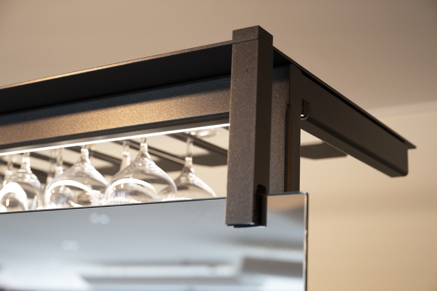 Réalisée en acier thermolaqué, la structure intègre un rack pour verres à pied élégant ainsi que des étagères pour le rangement d'éléments divers, de même qu'un support permettant la fixation de miroirs.