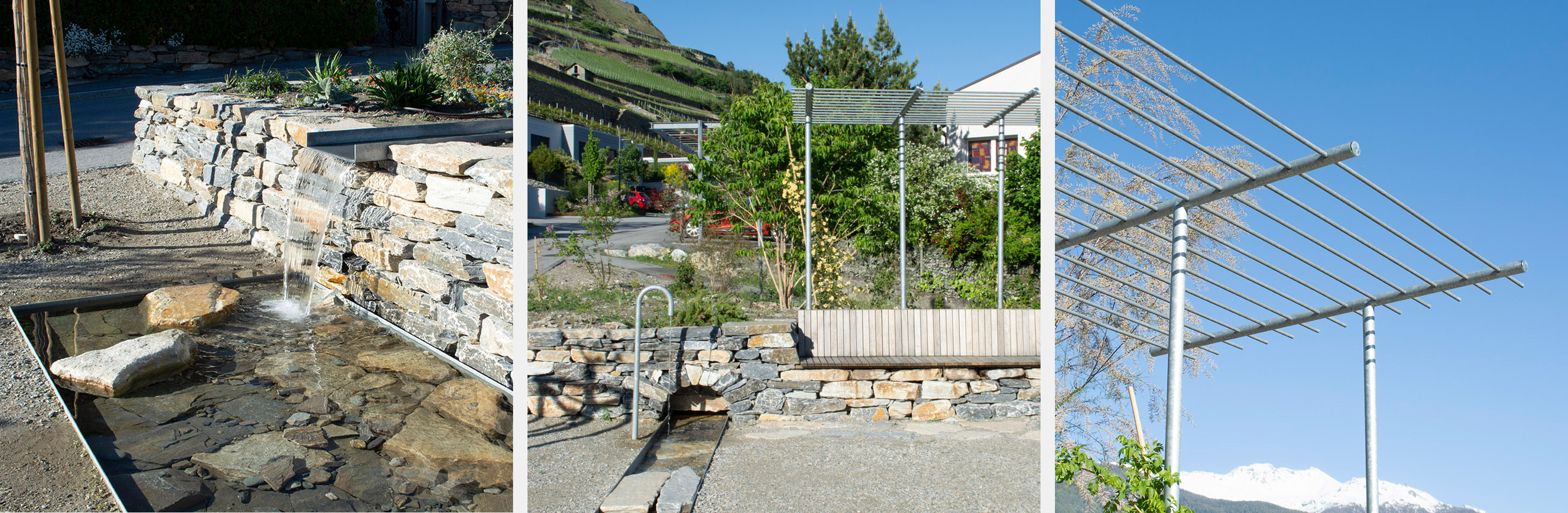Les pergolas ainsi que les différentes pièces du circuit aquatique (fontaine, bisse, bassin), réalisées sur mesure par SymerLine, participent à la fraîcheur et à la vie du lieu.