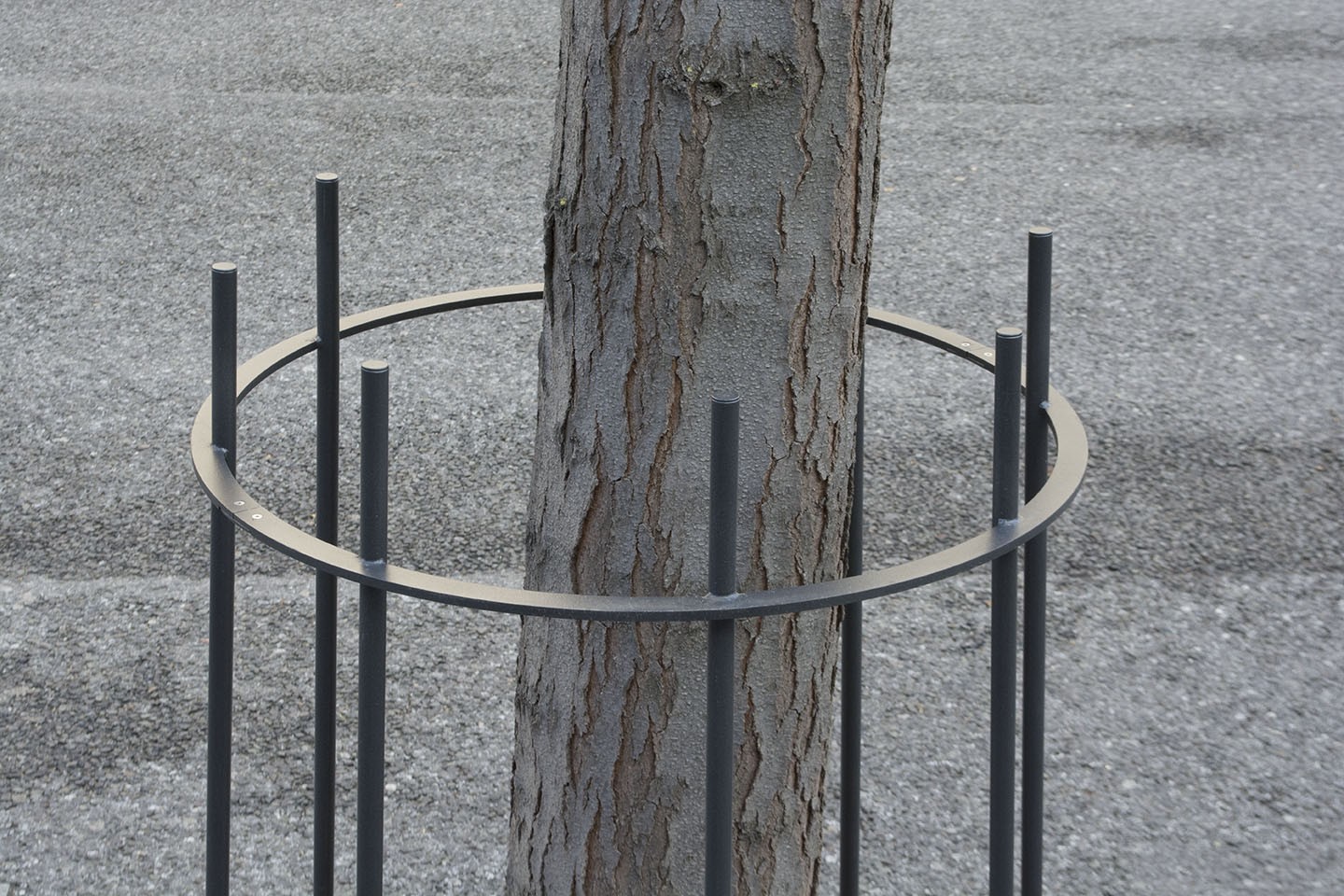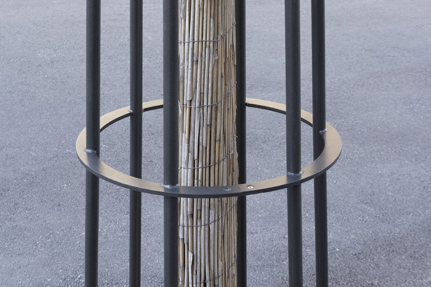 Corset d'arbre en acier thermolaqué, constitué de deux éléments assemblés par visserie.