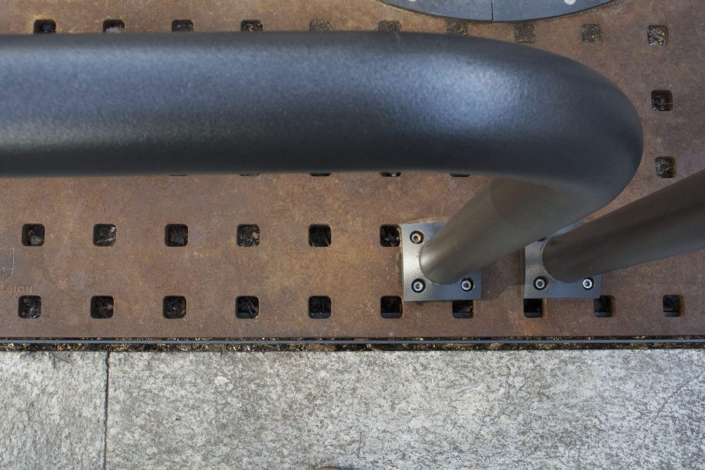 Arceau de protection en tube acier thermolaqué avec pattes de fixation, ajusté pour être monté sur l'ensemble des grilles d'arbre SymerLine.