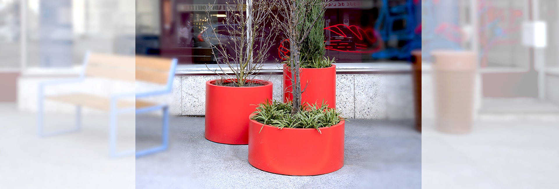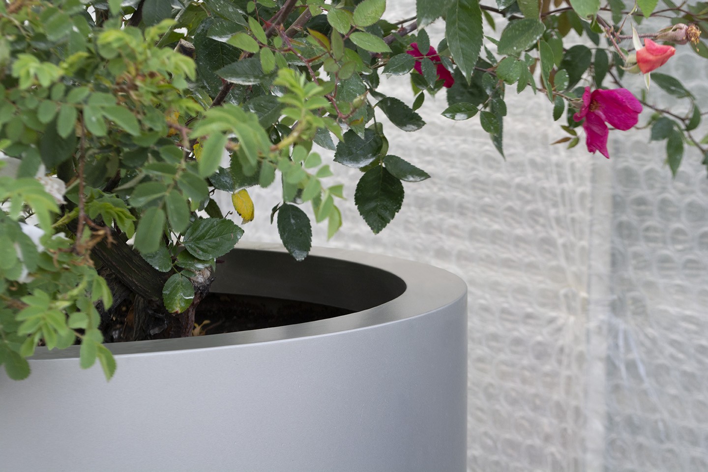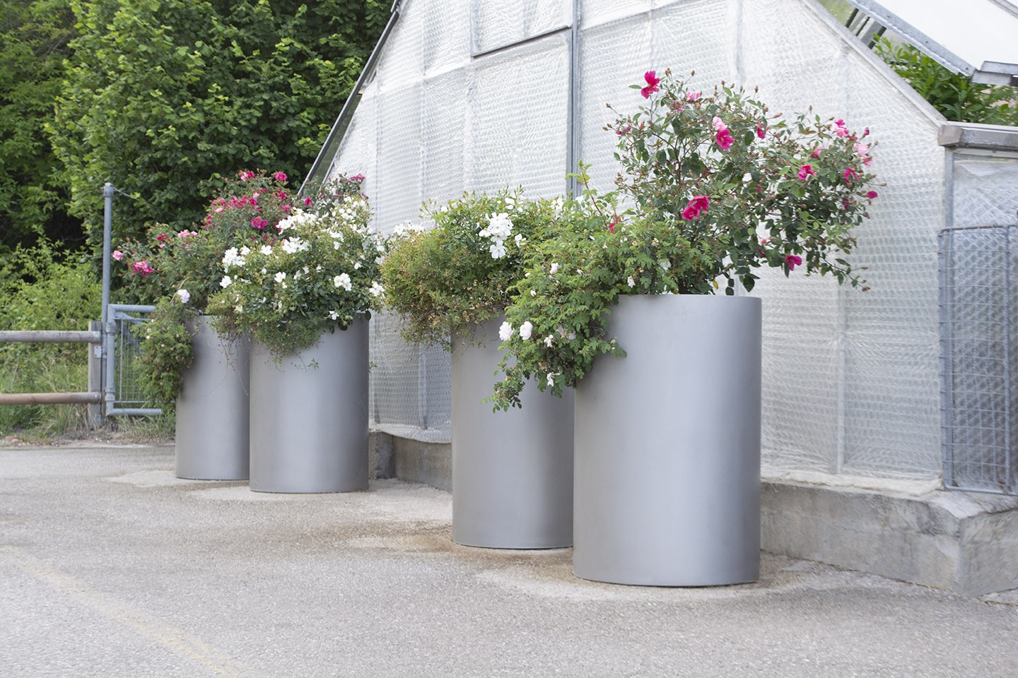 Jardinière cylindrique en acier inox microbillé ou thermolaqué, de tailles et hauteurs différentes.