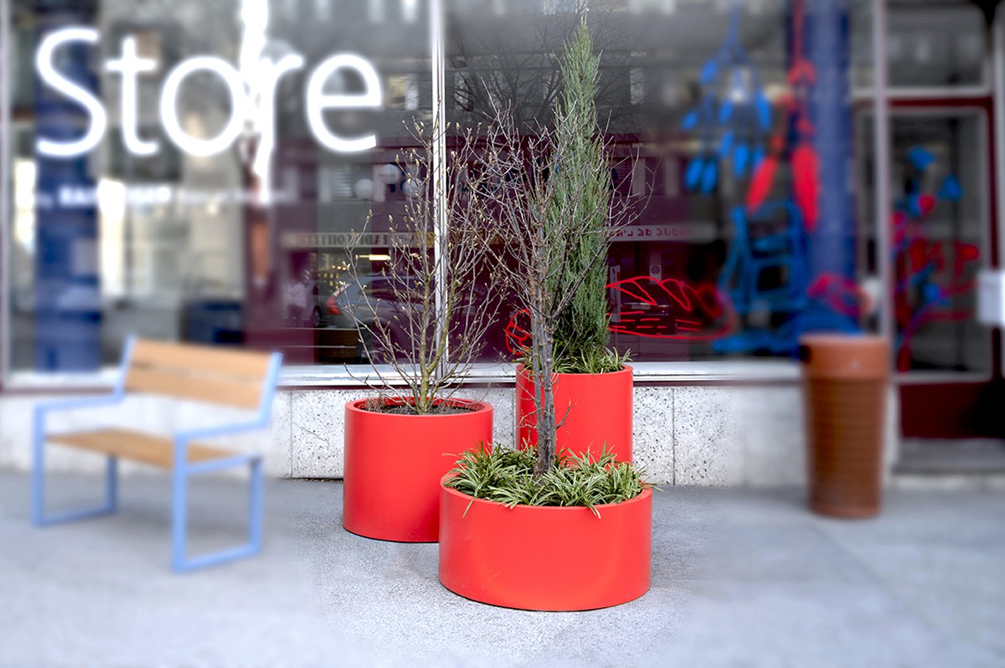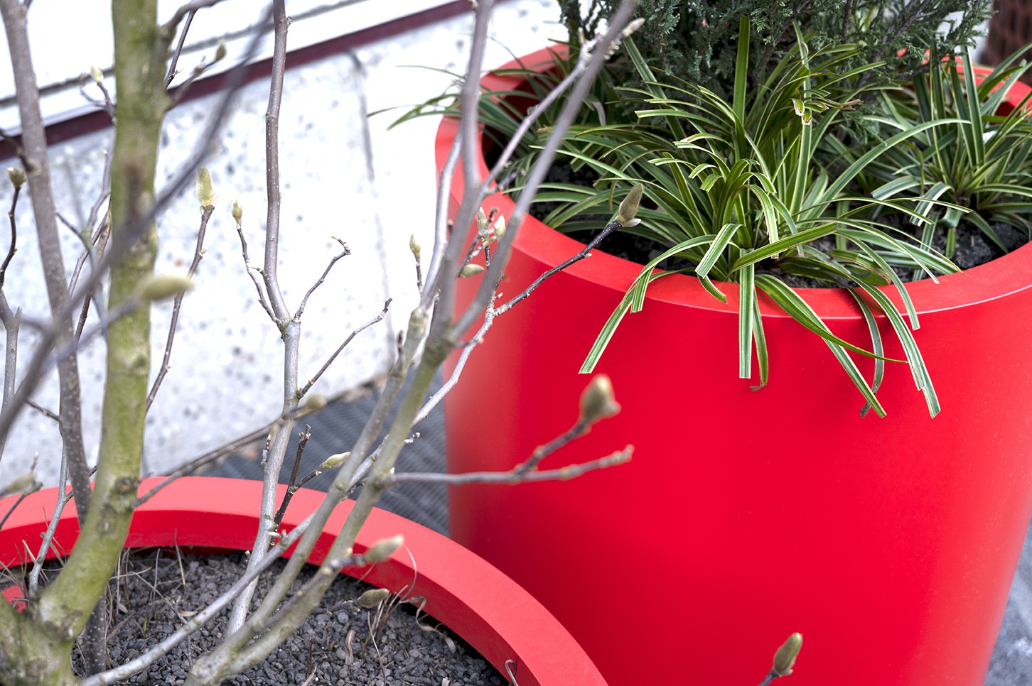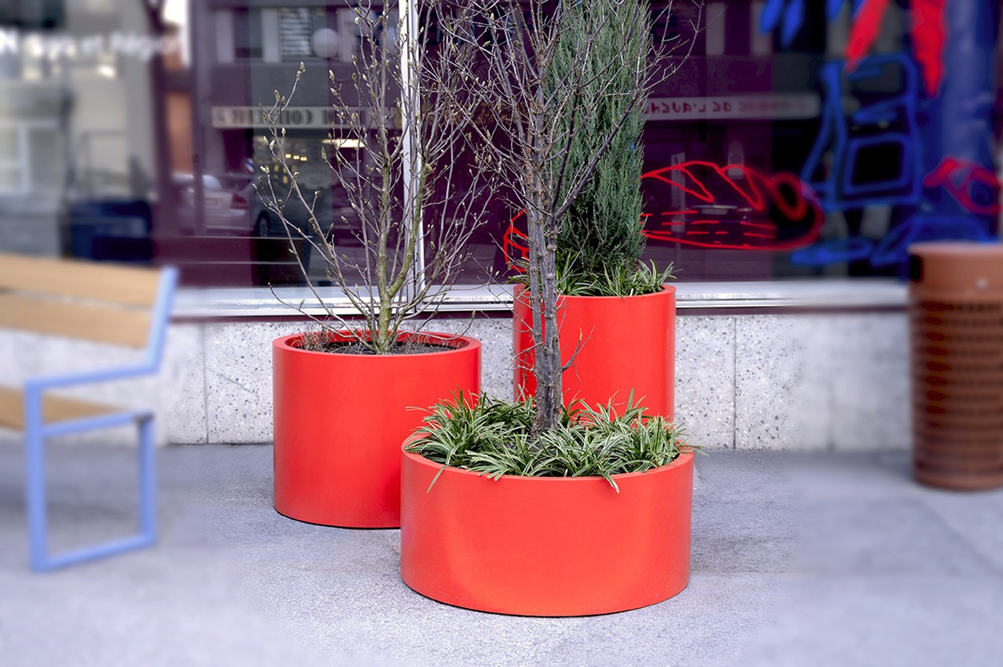 Jardinière cylindrique en acier inox microbillé ou thermolaqué, de tailles et hauteurs différentes.