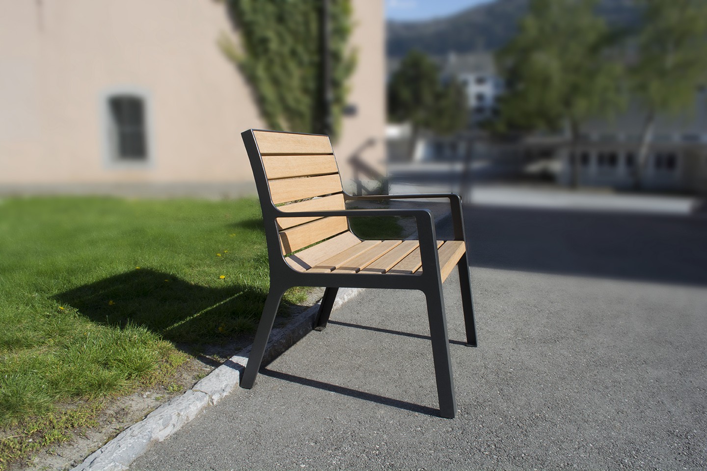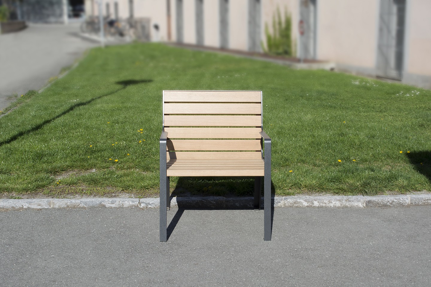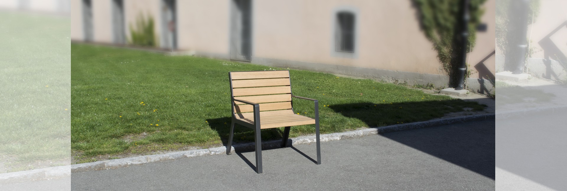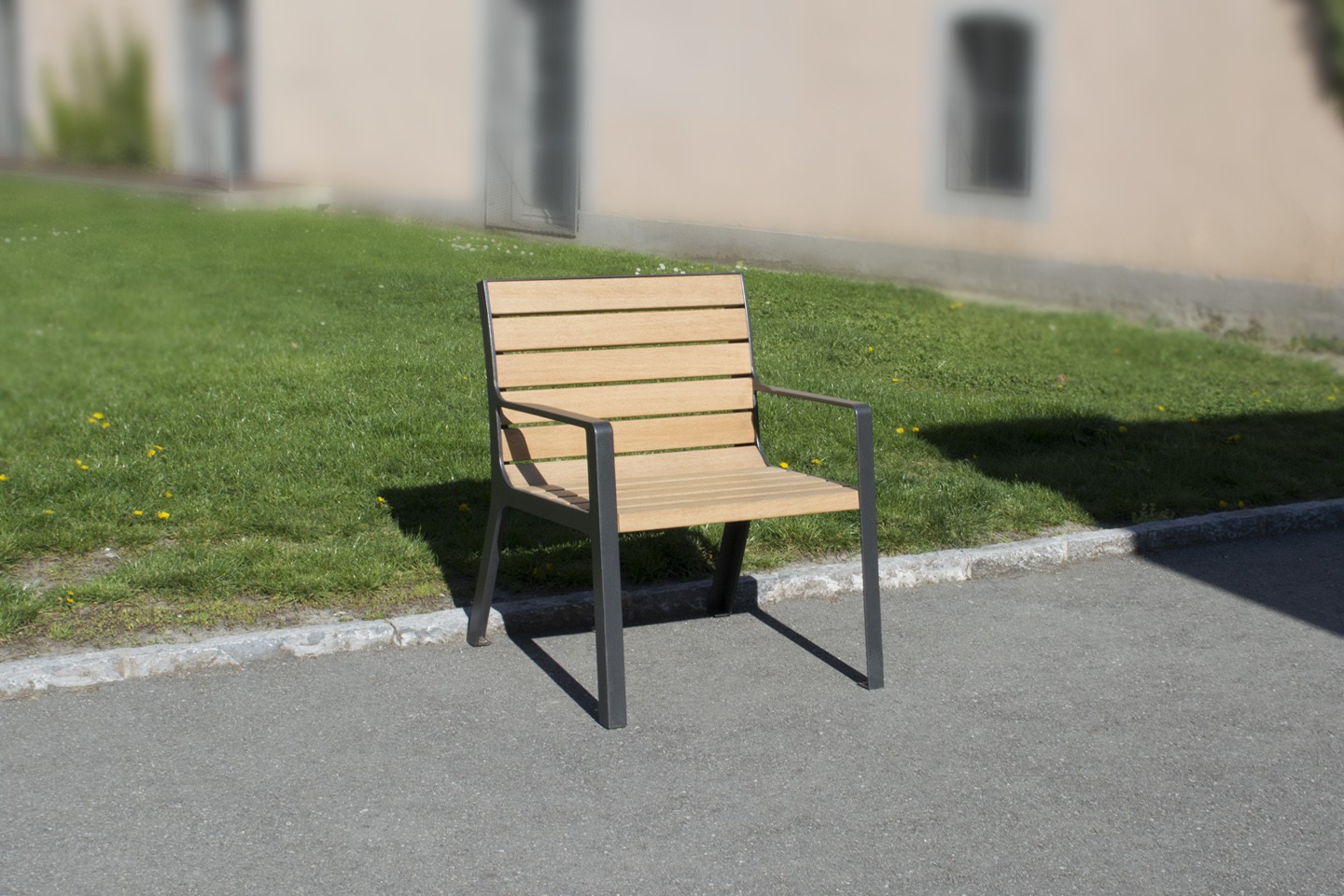 Fauteuil en bois et acier thermolaqué, confortable et ergonomique, avec accoudoirs.
