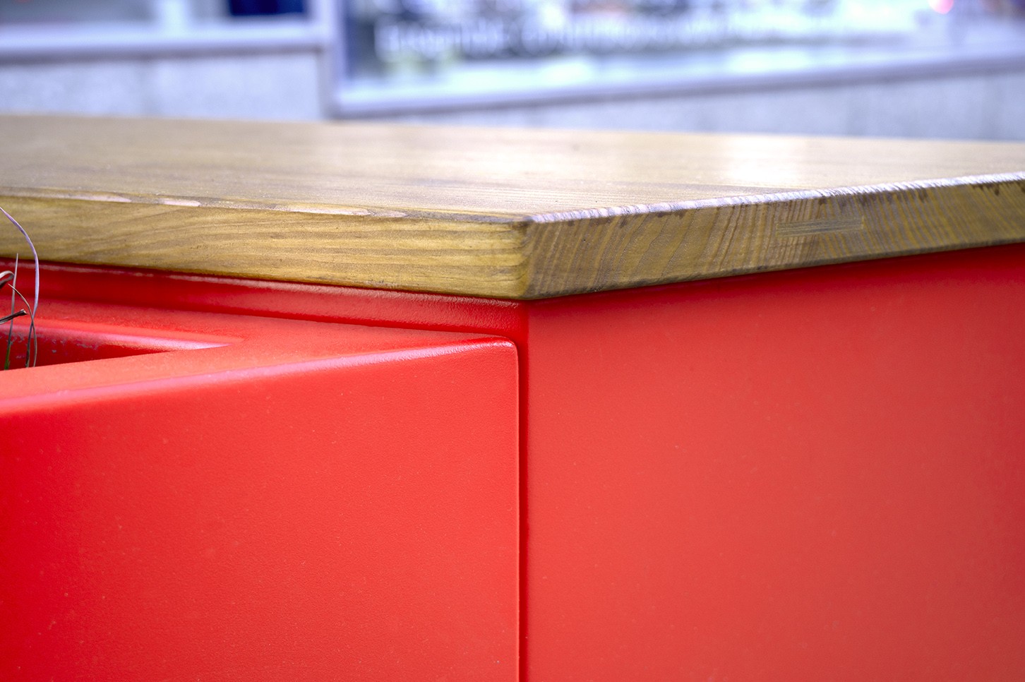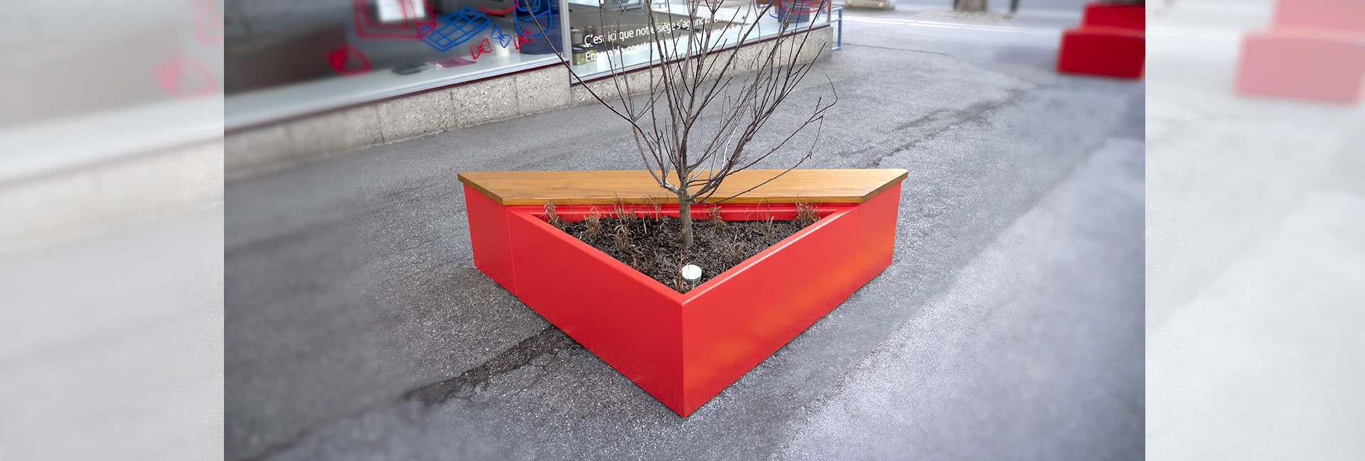 Jardinière triangulaire modulable avec banquette en bois.