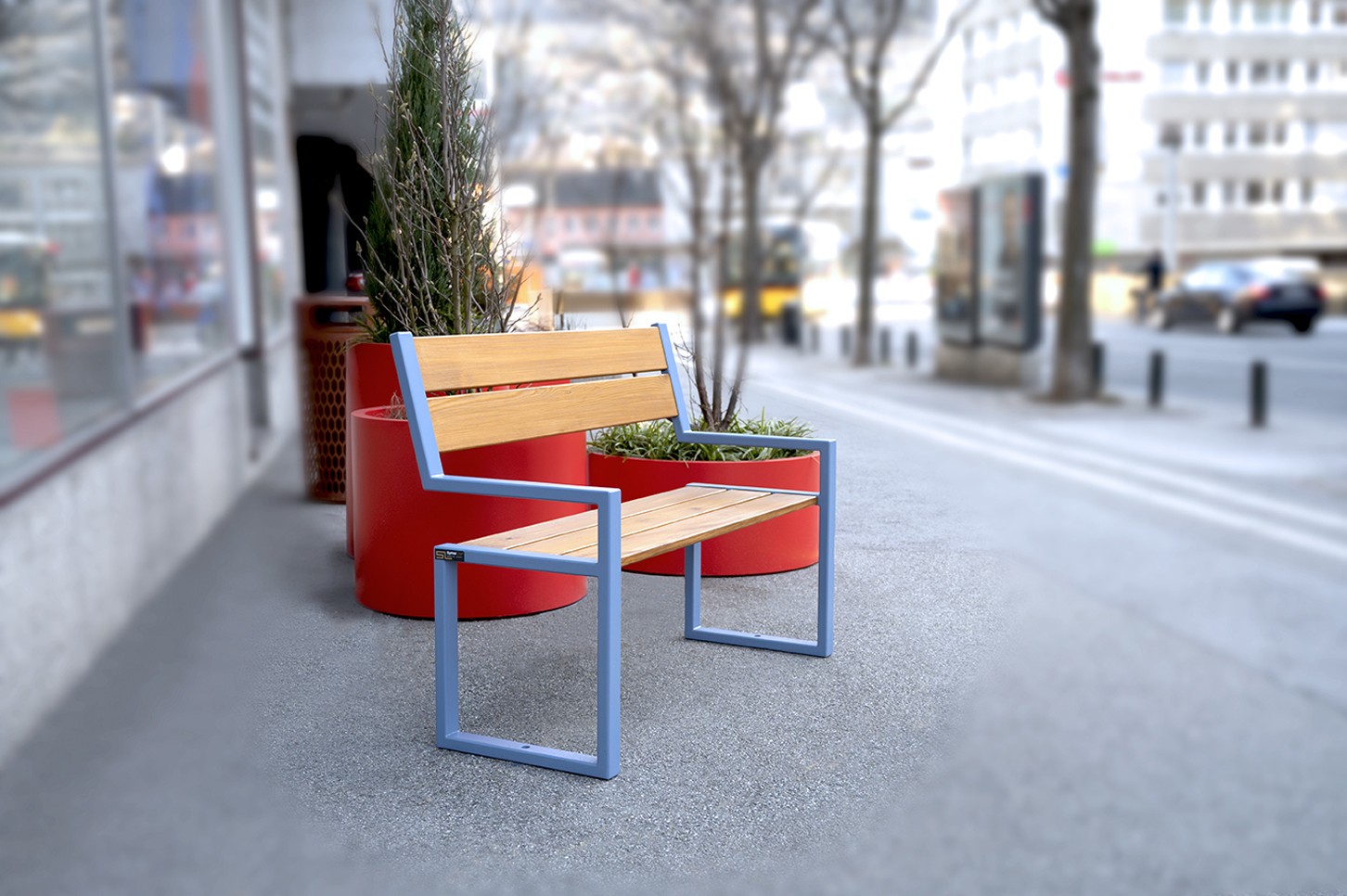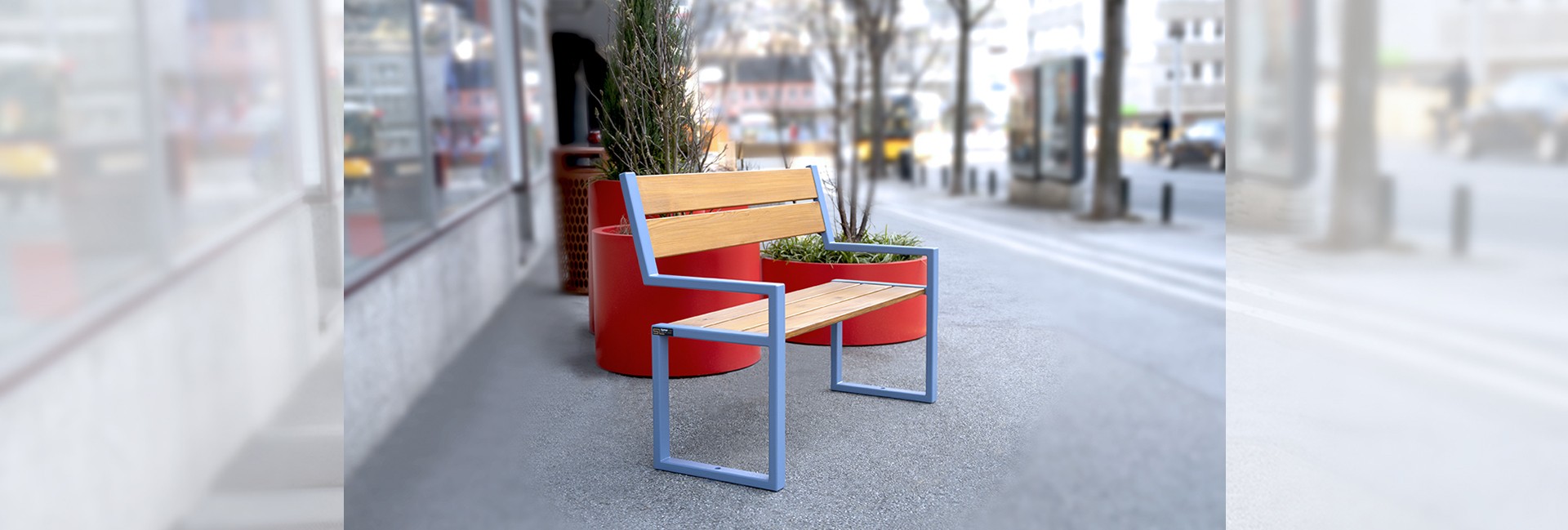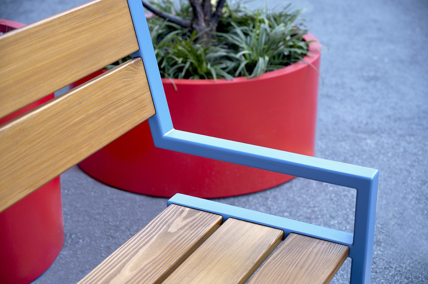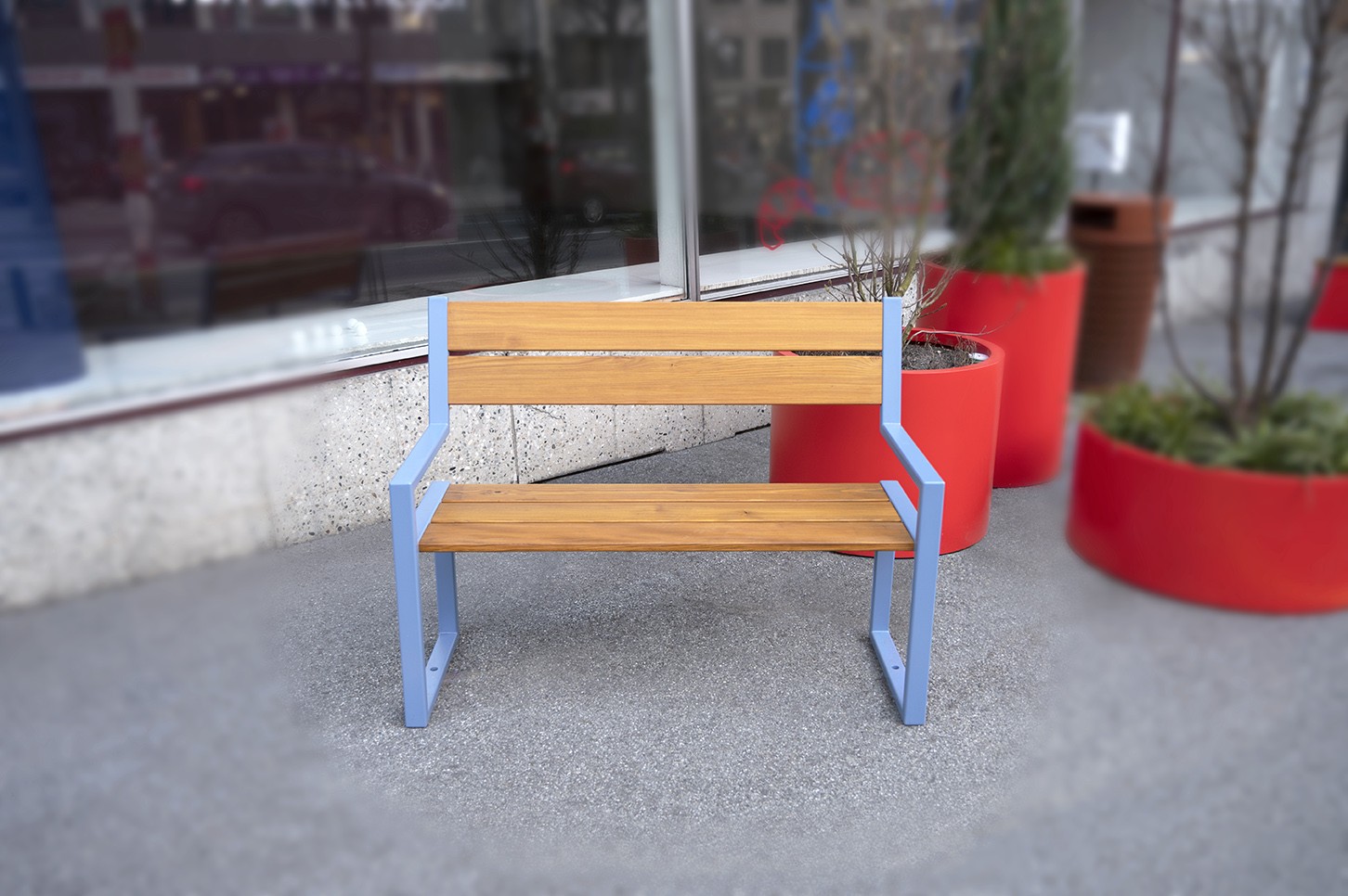 Banc 2 places en bois et acier thermolaqué, confortable et aérien, avec accoudoirs.