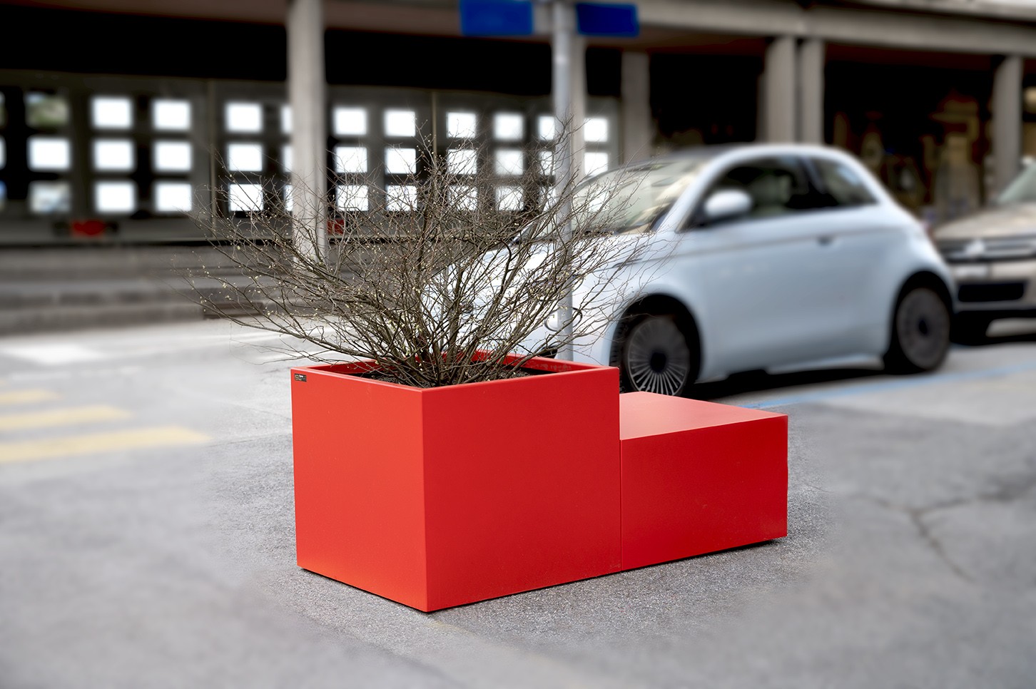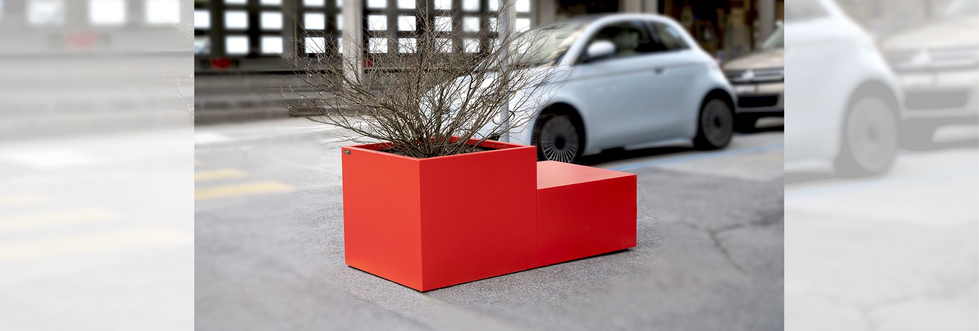 Jardinière carrée en acier thermolaqué, avec assise modulable.