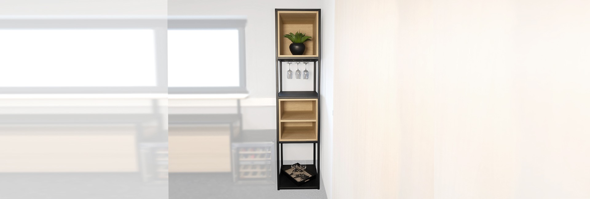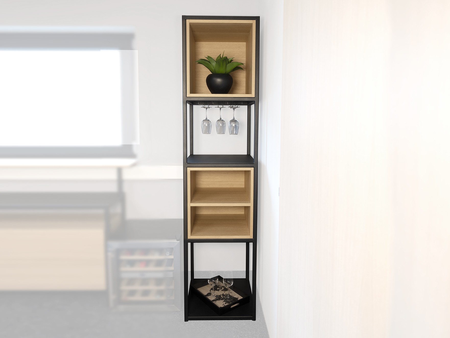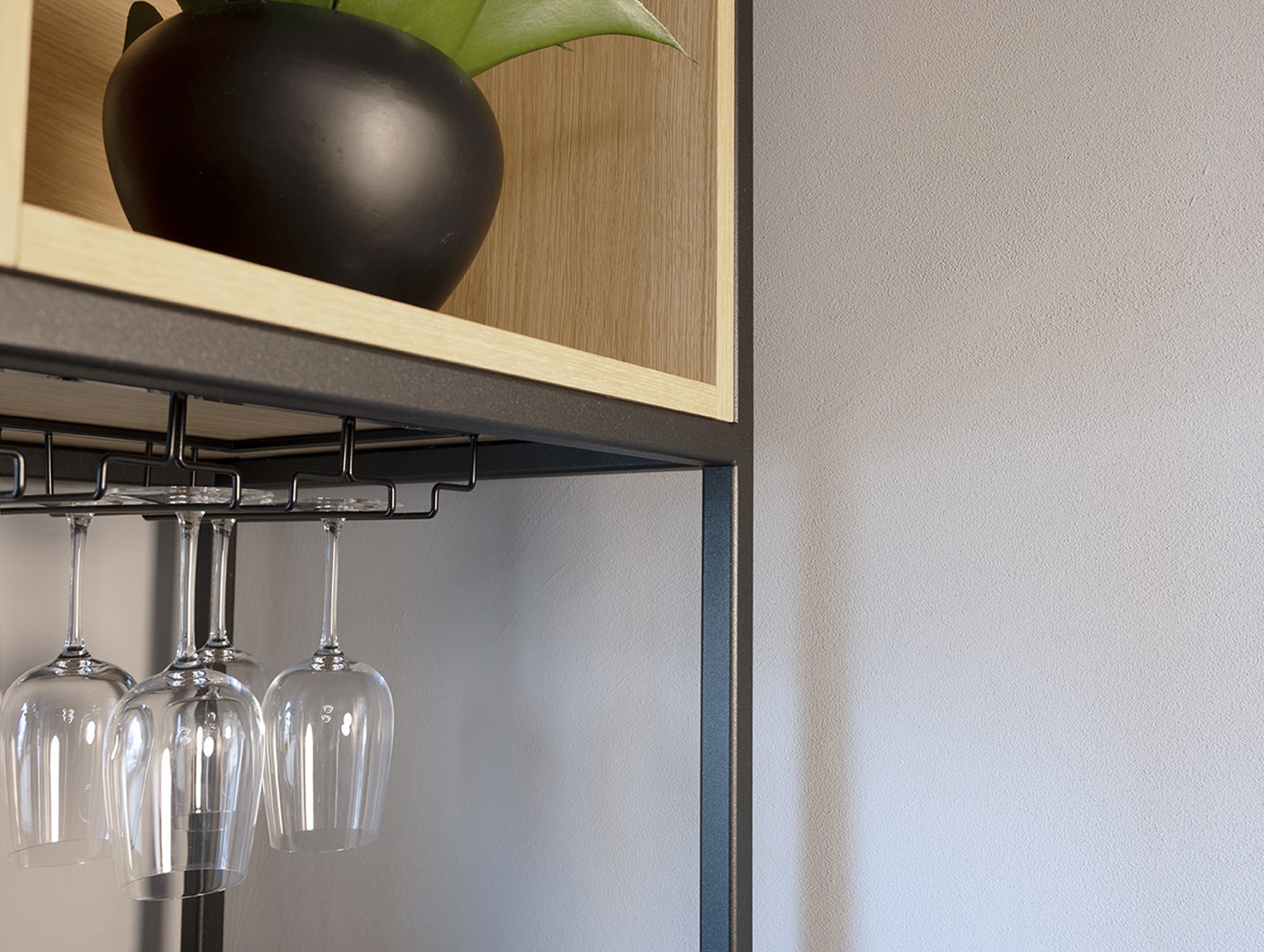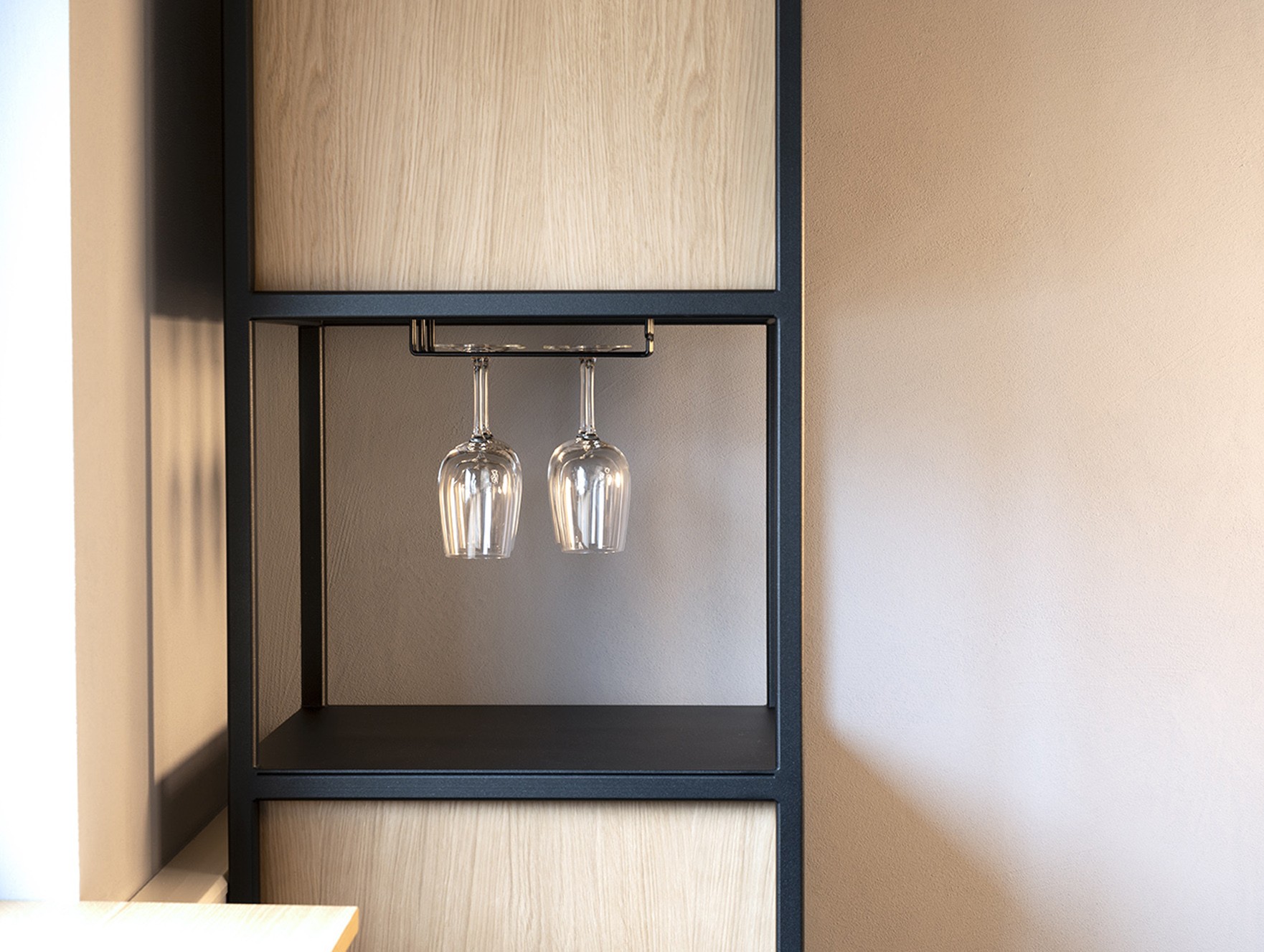 Etagère en chêne avec structure en acier thermolaqué, élégante et aérienne, avec rack à verres à pied.