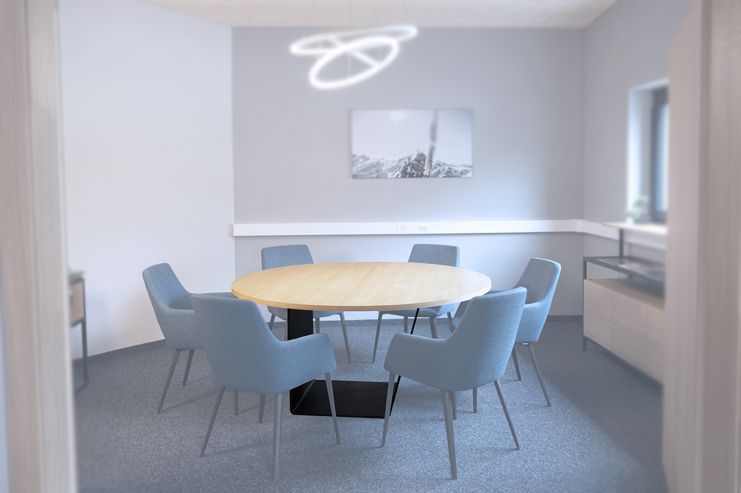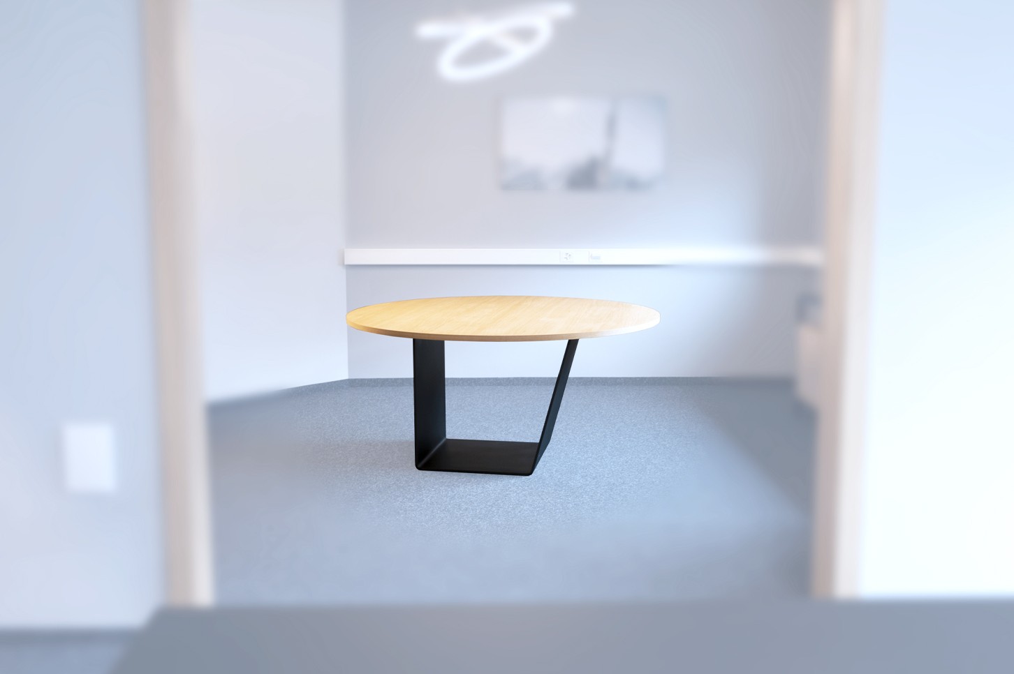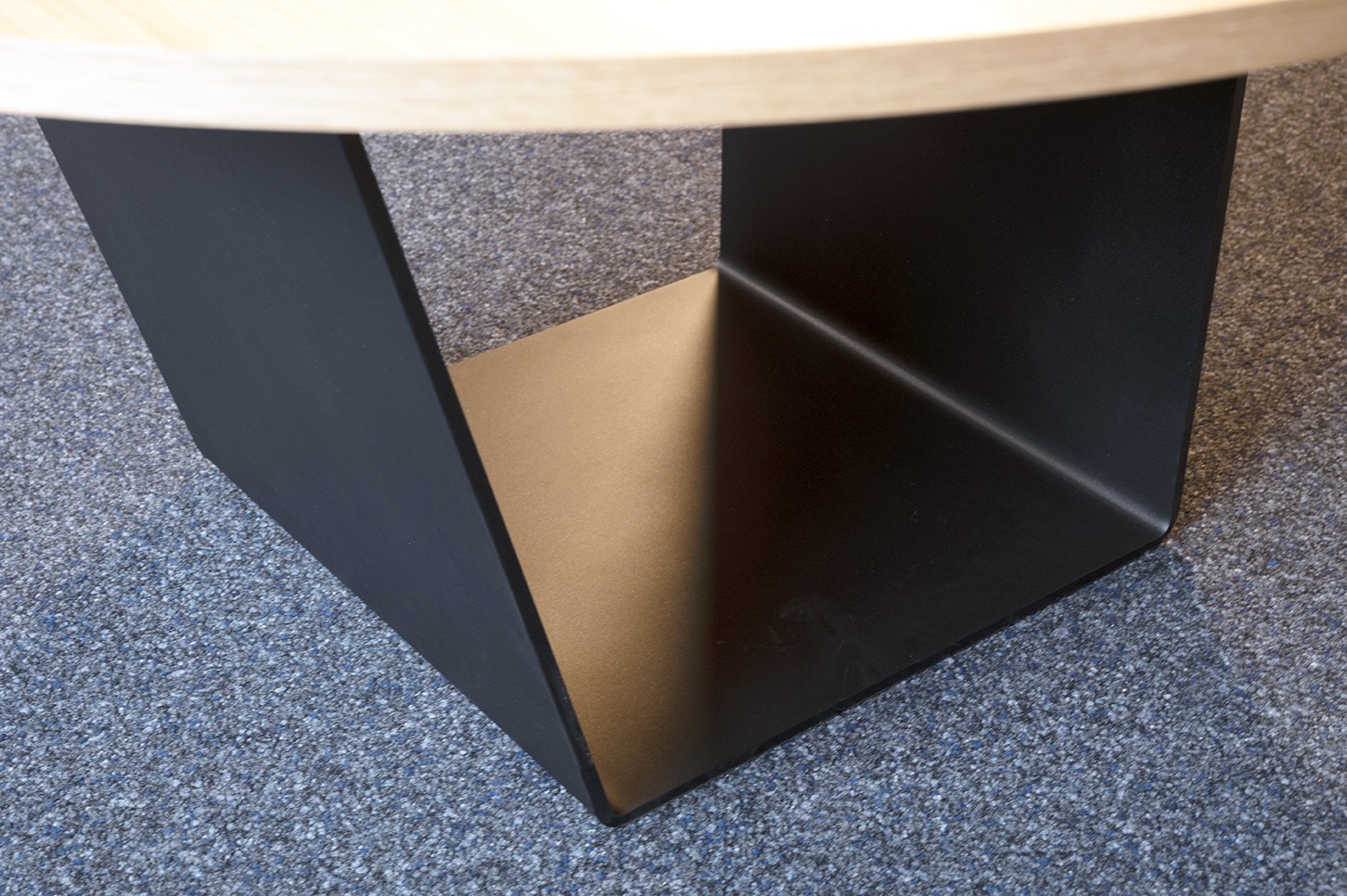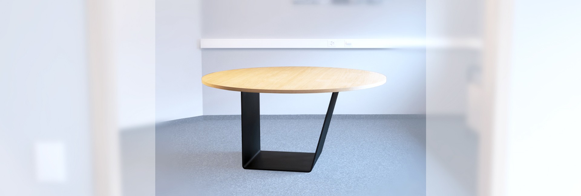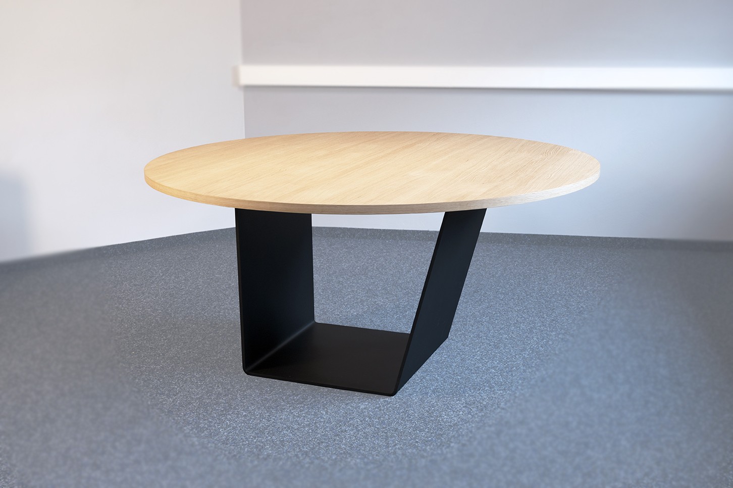 Table ronde en chêne avec pied en acier thermolaqué géométrique.
