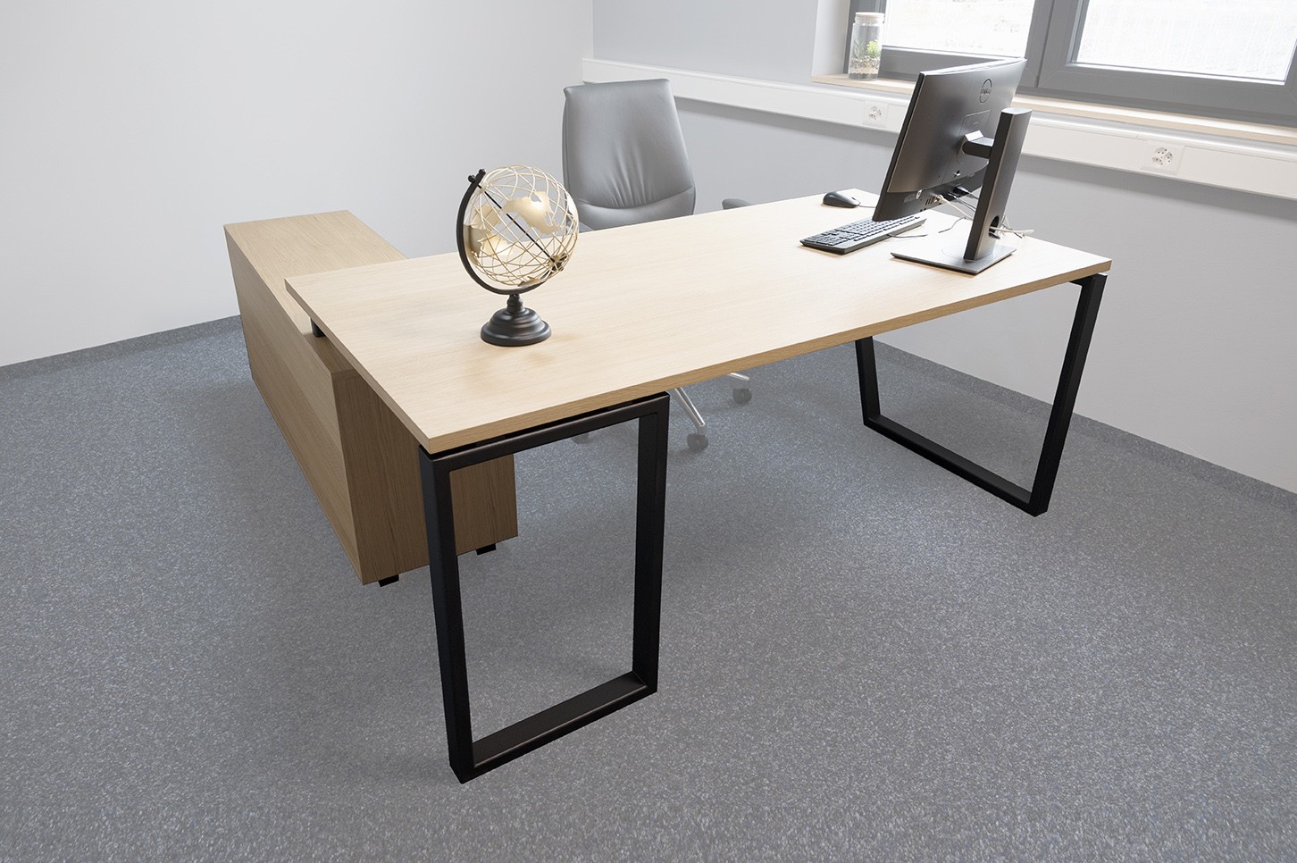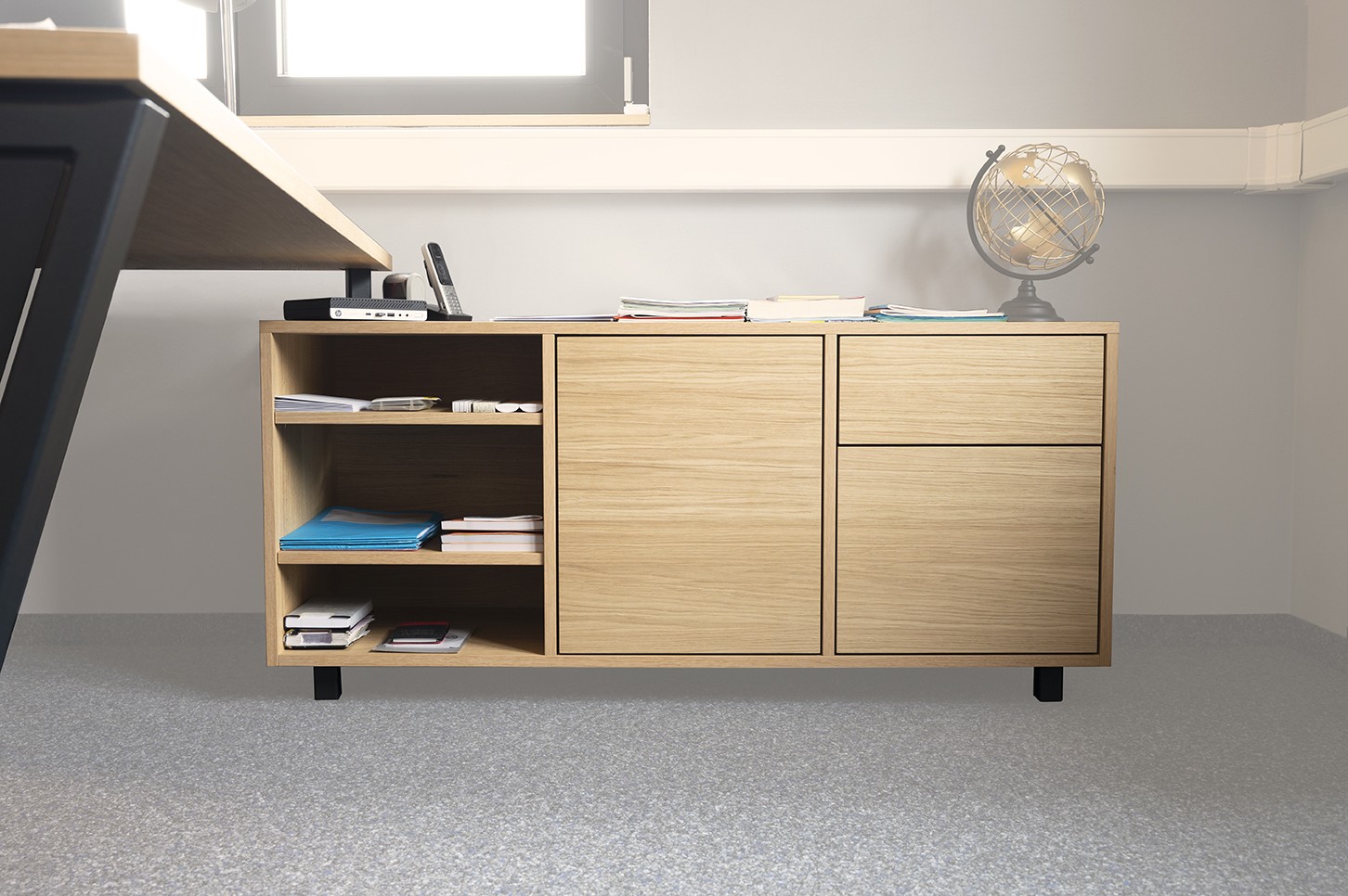 Bureau en chêne avec structure en acier thermolaqué et meuble de rangement intégré, élégant et confortable. Finitions des pieds à choix.