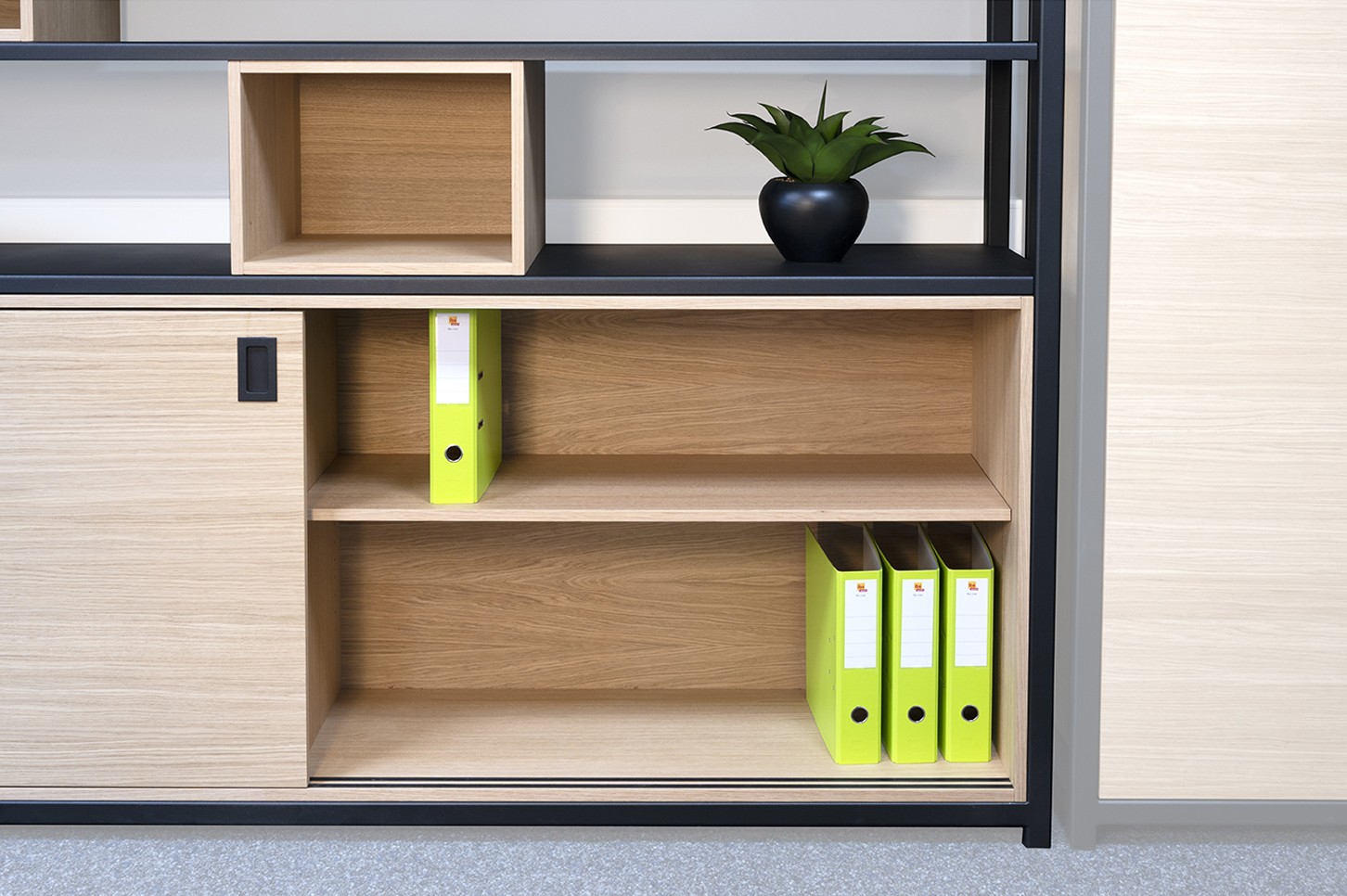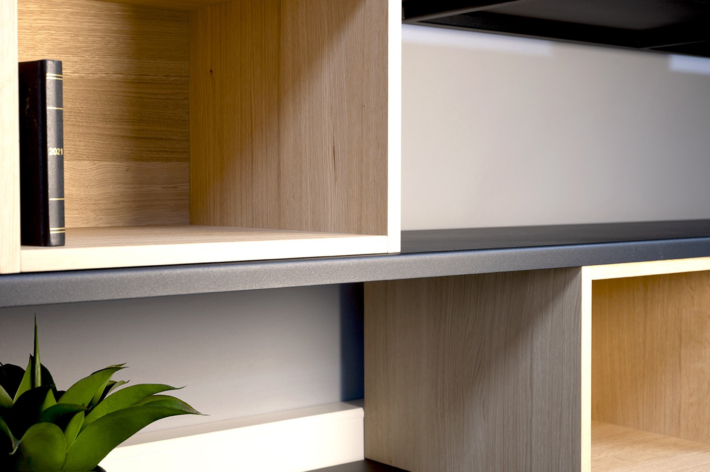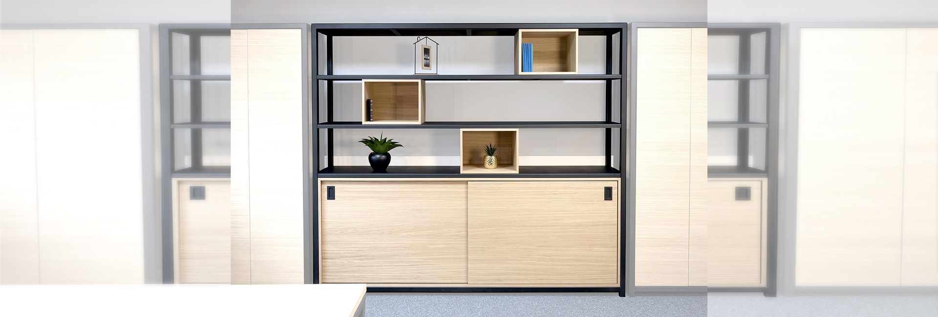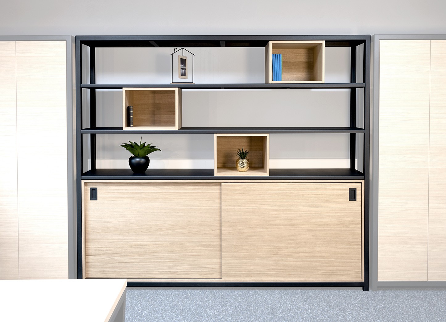 Bibliothèque en acier thermolaqué avec armoires en bois intégrées et caissons en chêne modulables. Créative, élégante et fonctionnelle, avec tablettes intérieures modulables.