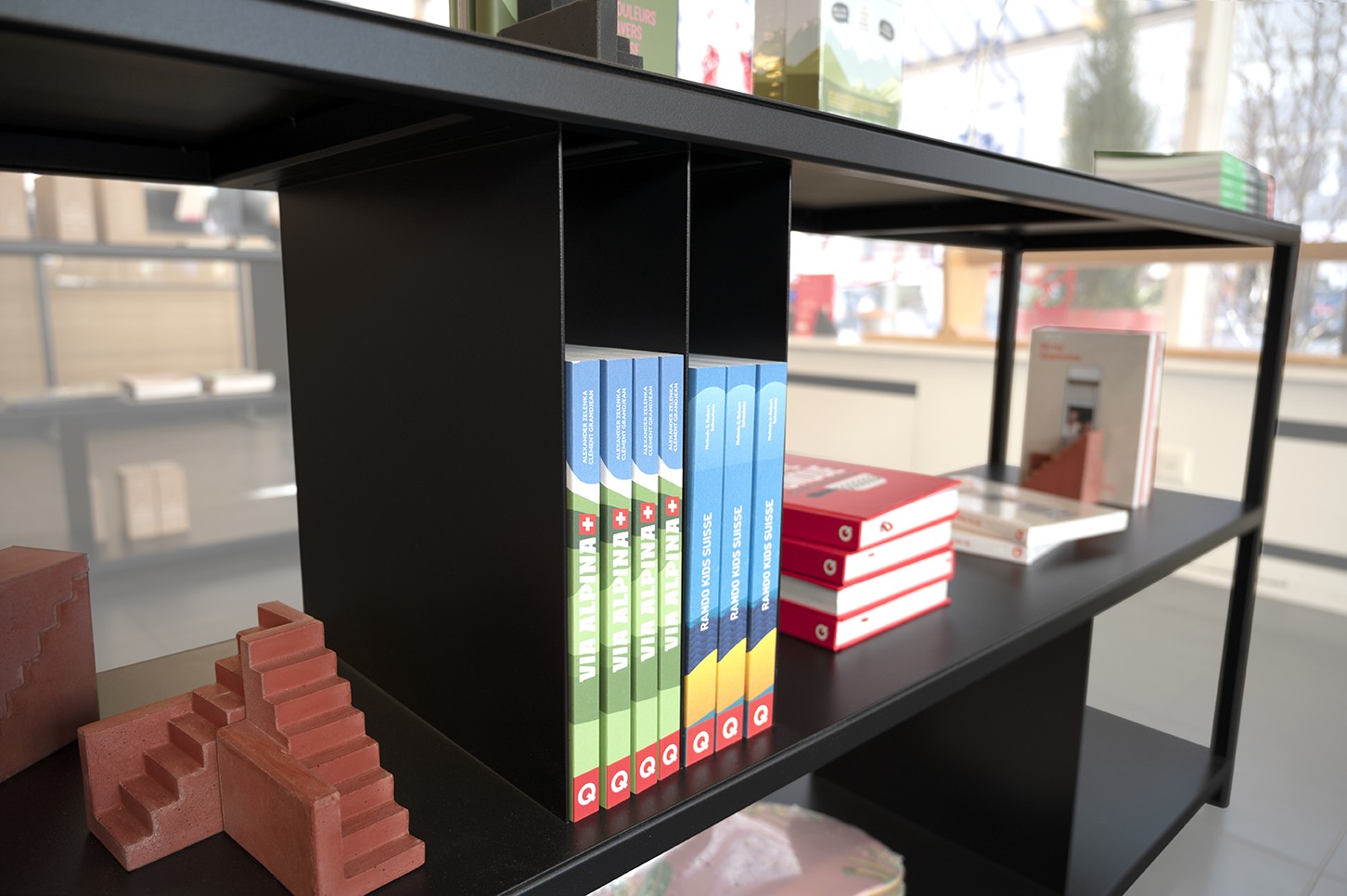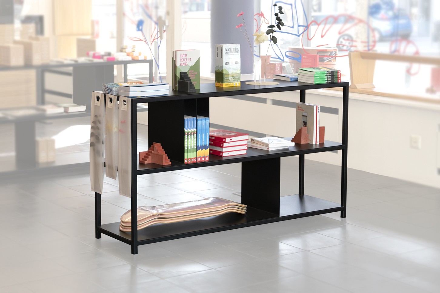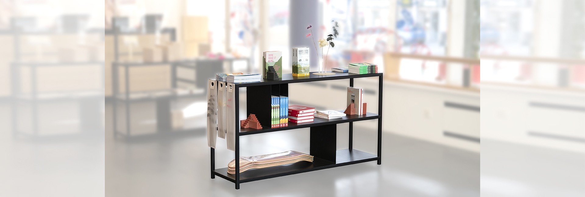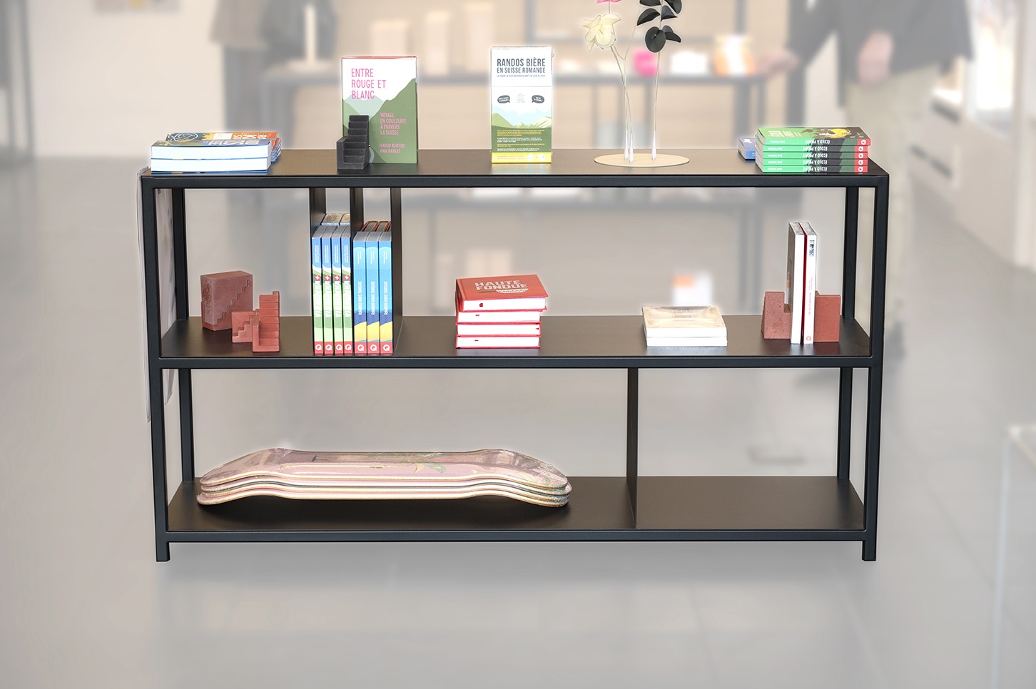Etagère basse en acier thermolaqué, élégante et fonctionnelle, avec séparations intégrées.