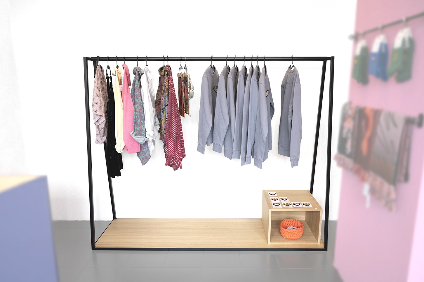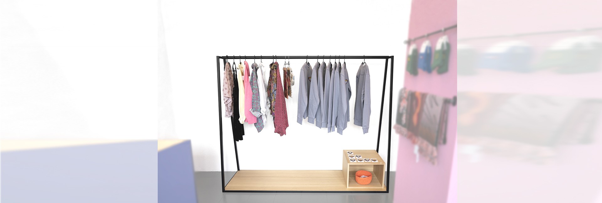 Penderie en acier thermolaqué et chêne, moderne et aérienne.