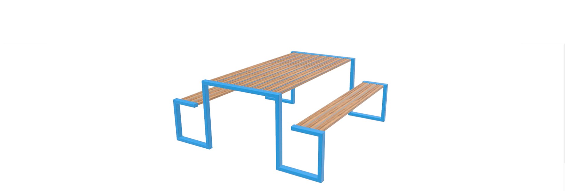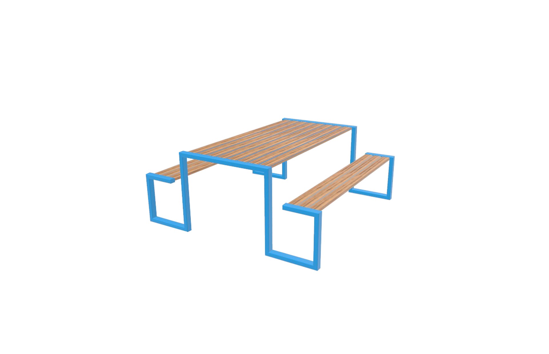 Table de pique-nique avec bancs intégrés, en acier thermolaqué et bois indigène.