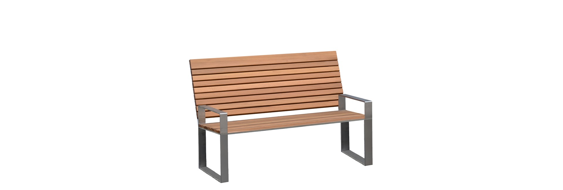 Banc 2 places en inox et mélèze, moderne et élégant, avec accoudoirs.