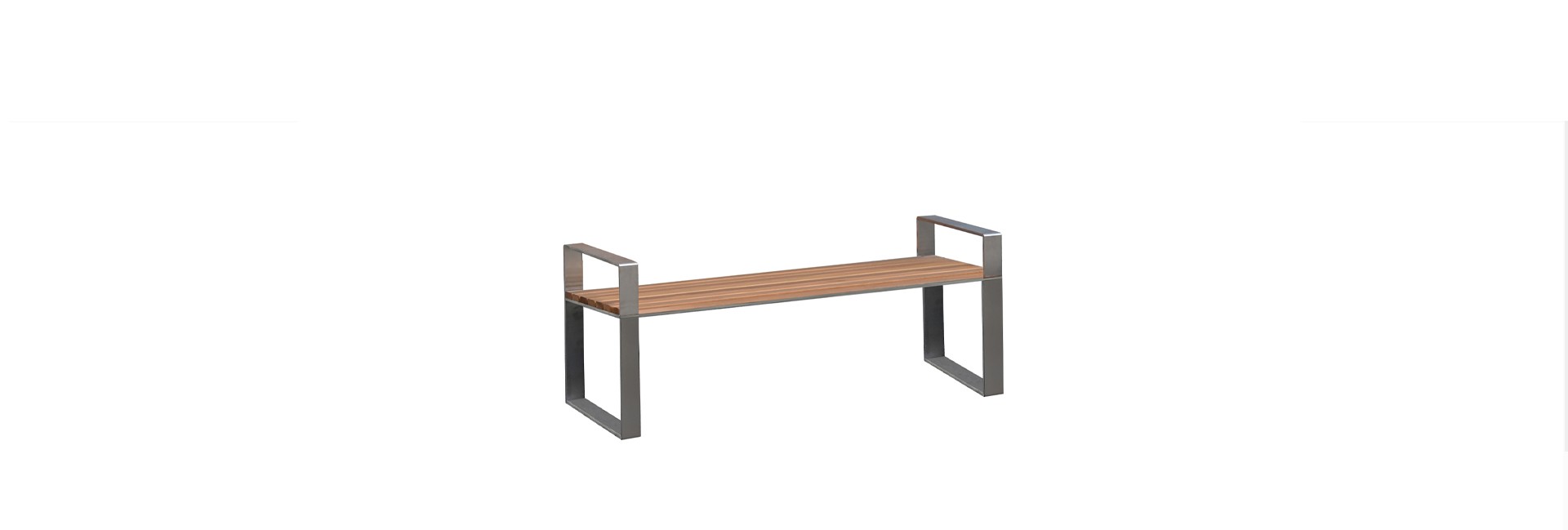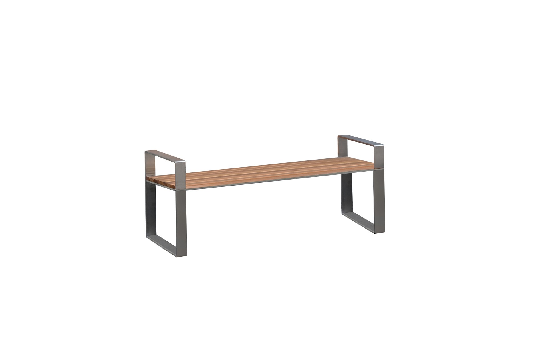 Banquette 2 places en inox et mélèze, moderne et élégante, avec accoudoirs.
